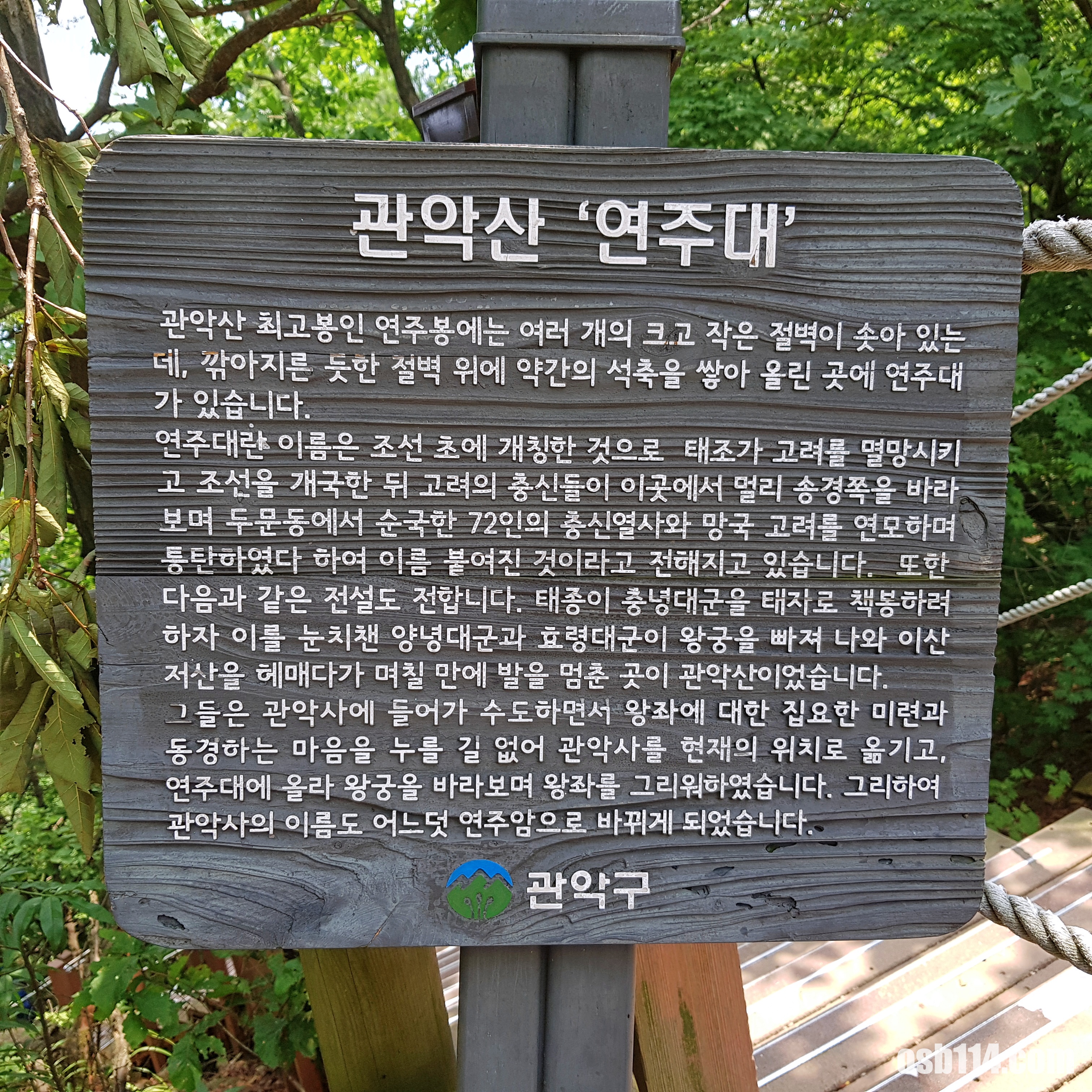 - 그들은 관악사에 들어가 수도하면서 왕좌에 대한 집요한 미련과 동경하는 마음을 누를 길 없어 관악사를 현재의 위치로 옮기고, 연주대에 올라 왕궁을 바라보며 왕좌를 그리워하였습니다. 그리하여 관악사의 이름도 어느덧 연주암으로 바뀌게 되었습니다.