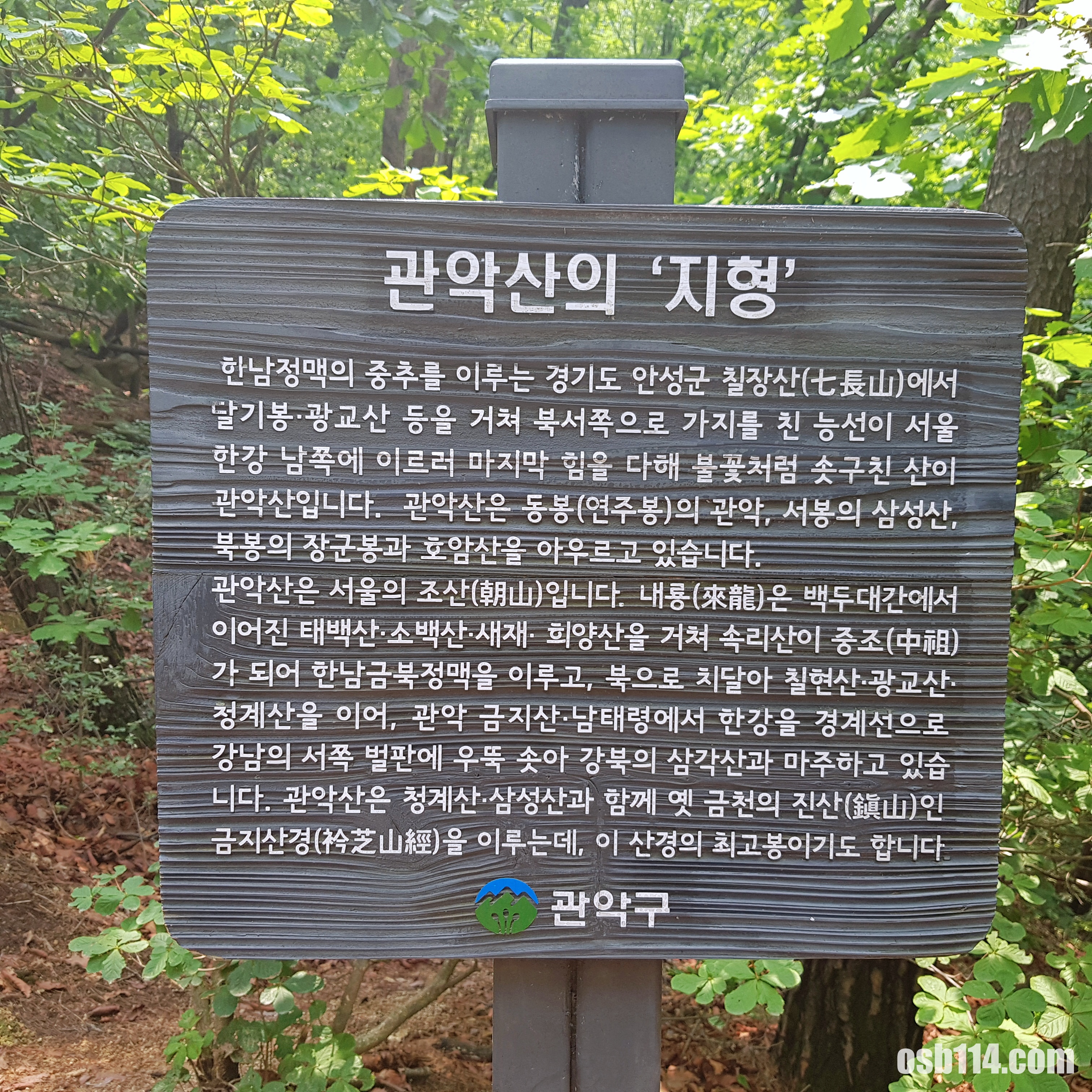 - 관악산은 서울의 조산입니다. 내룡은 백두대간에서 이어진 태백산, 소백산, 새재, 회양산을 거쳐 속리산이 중조가 되어 한남금북정맥을 이루고, 북으로 치달아 칠현산, 광교산, 처예산을 이어, 관악 금지산.남태령에서 한강을 경계선으로 강남의 서쪽 벌판에 우뚝 솟아 상북의 삼각산과 마주하고 있습니다. 관악산은 청계산.삼성산과 함께 옛 금천의 진산인 금지산경을 이루는데, 이 산경의 최고봉이기도 합니다.