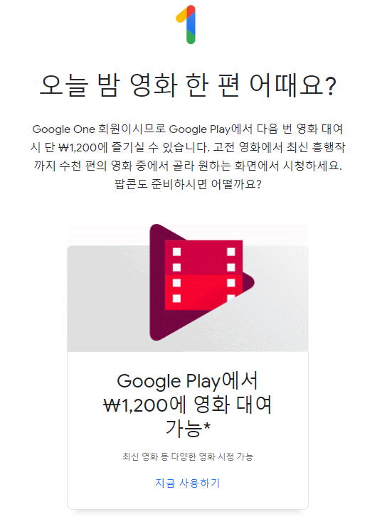 처음에는 그냥 구글 드라이브 용량 늘리는 목적으로 가입했었는데, 최근에 영화 할인 쿠폰을 준 적이 있었습니다.