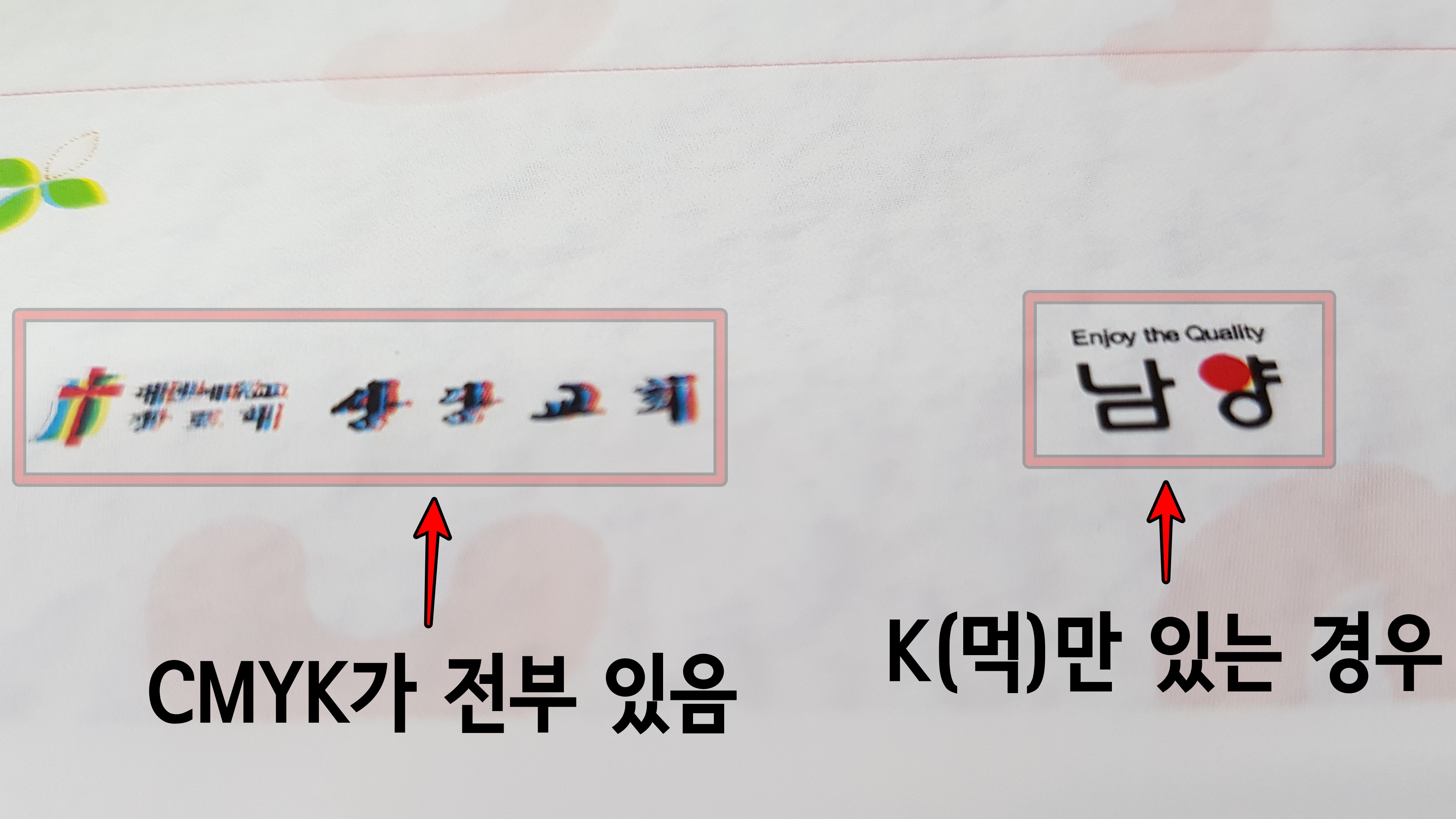 때문에 인쇄 시 CMYK의 위치가 서로 맞지 않는다면 위와 같은 현상이 발생합니다.