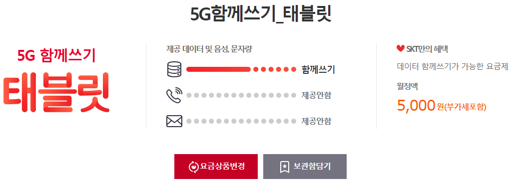 추가로 SK는 5G 요금을 사용할 경우 월 5,000원을 내면 태블릿과 데이터 공유를 할 수 있습니다.