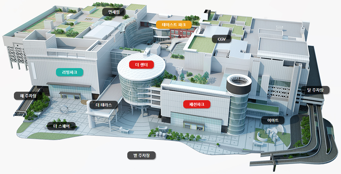 리빙파크 뒤편, 테이스트 파크 오른편에는 아이파크 몰 신라아이파크 면세점이 있습니다.