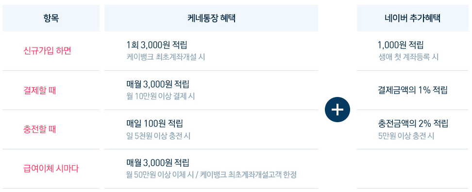 | No. | 항목 | 케네통장 혜택 | 네이버 추가혜택 |