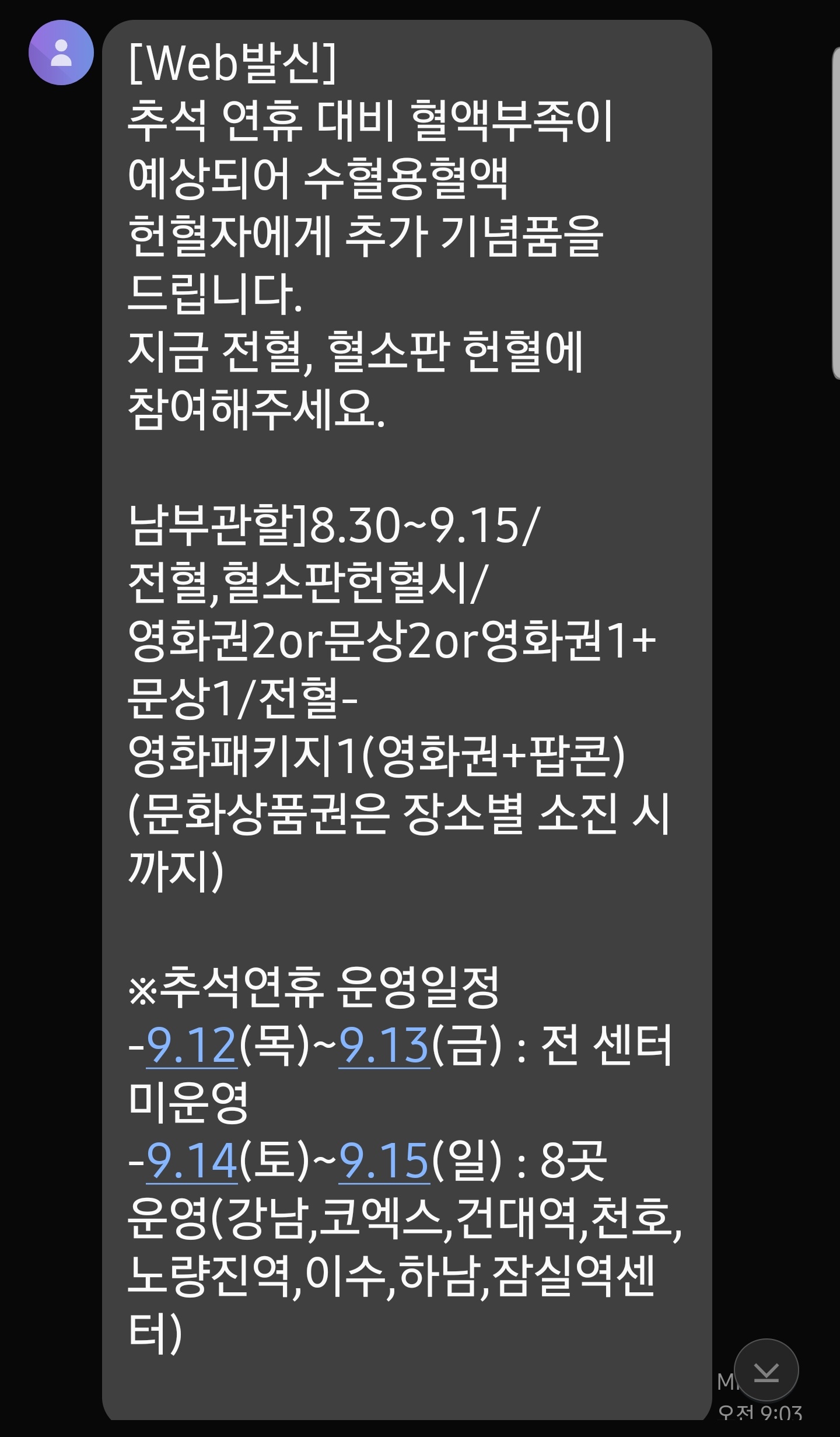 추석 연휴에 혈액부족이 예상되어 헌혈 좀 해달라는 문자였습니다. 헌혈 시 영화표 또는 문상 2장을 준다는 얘기도 있었습니다.