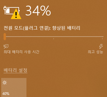 하단의 알림 메시지를 통해 노트북이 정상적으로 충전 중임을 확인할 수 있었습니다.