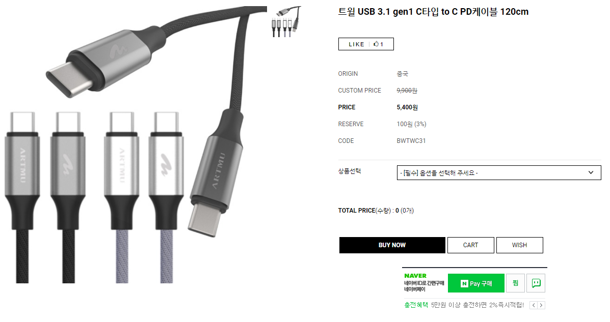 제가 고른 제품은 아트뮤에서 판매하는 트윌 USB 3.1 gen1 C타입 to C PD케이블이었습니다.