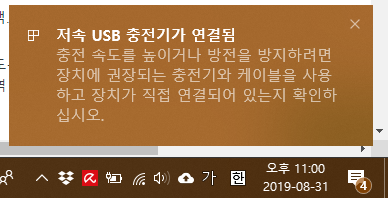 알림 창에 저속 USB 충전기가 연결되었다는 메시지가 떴습니다.