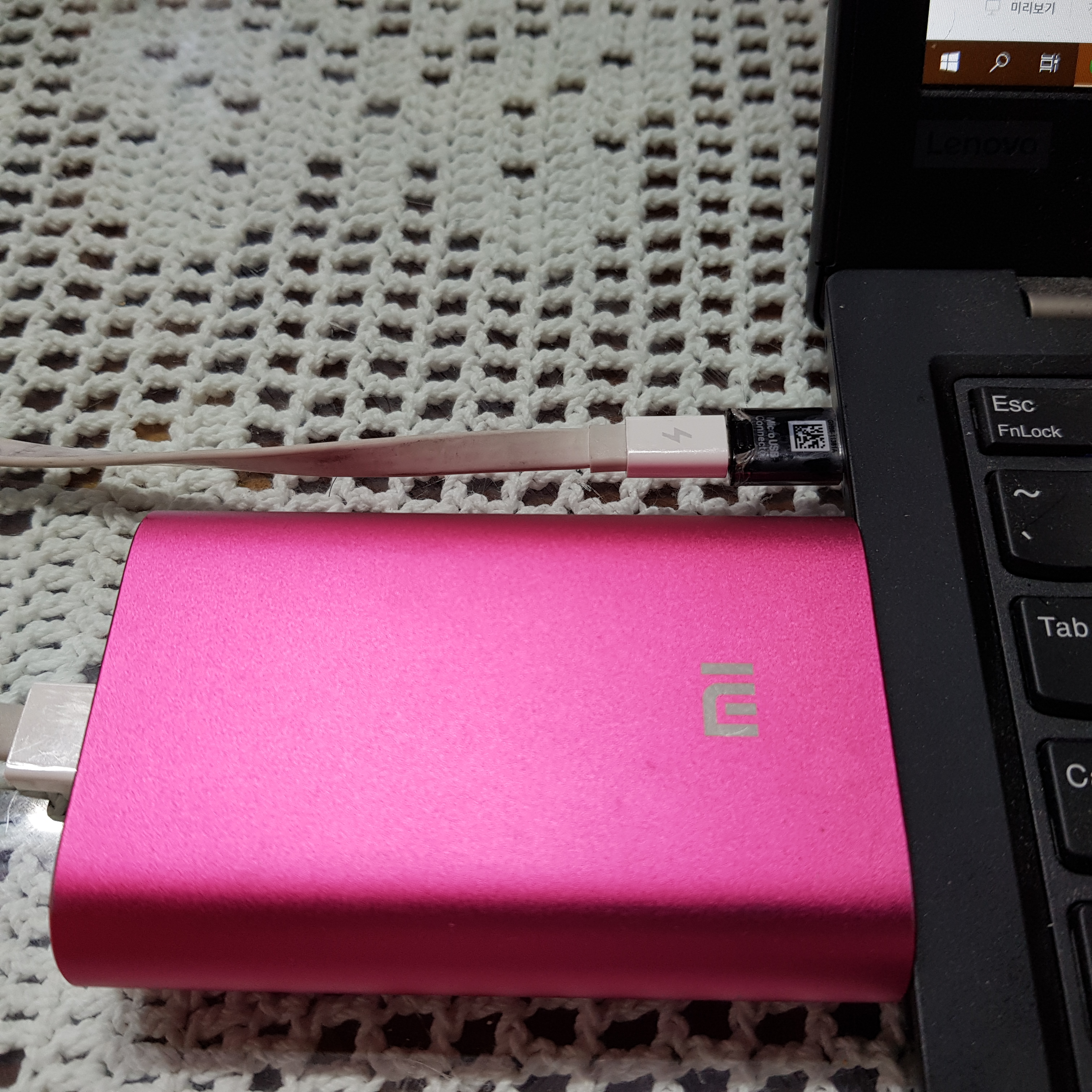 이번엔 샤오미 보조배터리 20000 4세대로 충전해 보겠습니다. 마찬가지로 노트북 전원 LED에 불이 정상적으로 들어옵니다.