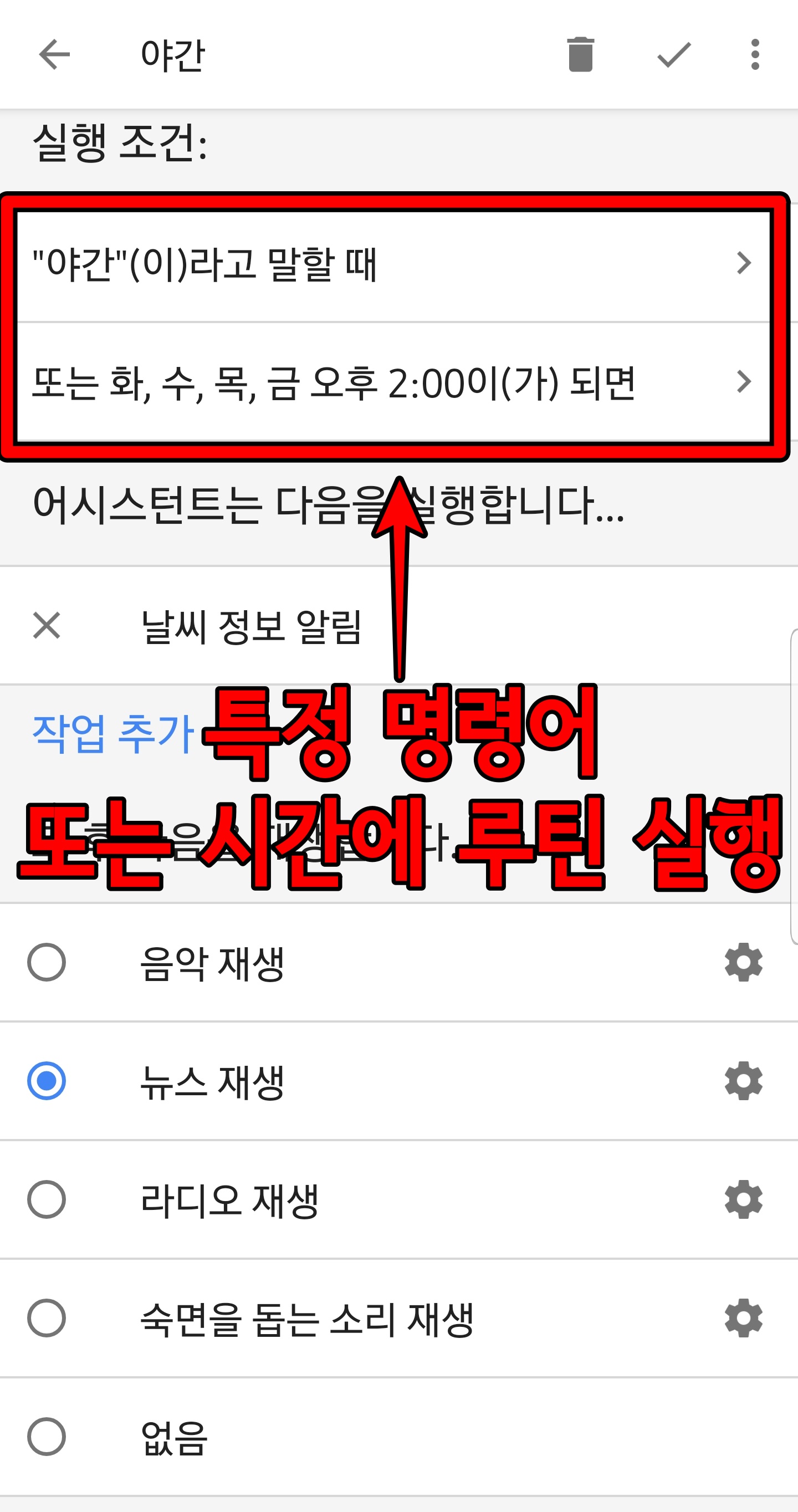 하지만 제가 원하는 건 야간이라고 명령을 했을 시 알람 시간을 자동으로 맞춰주고, 날씨와 뉴스 브리핑을 실행하는 것이었습니다.
