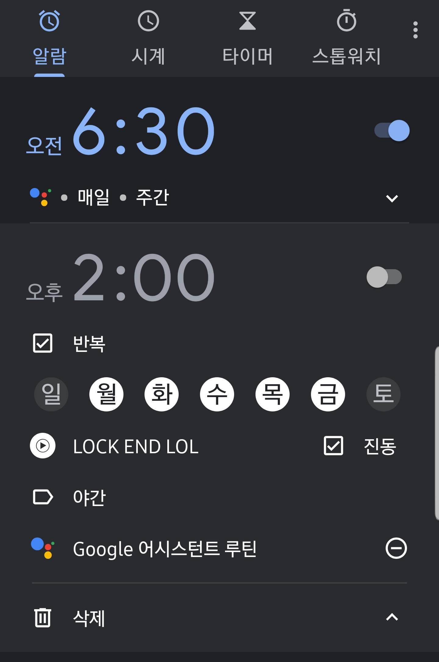 알람에 주간, 야간 태그를 붙이고 구글 어시스턴트에게 주간 취소하고 야간 실행해줘 라고 하면 자동으로 주간 알람을 끄고 야간 알람을 실행합니다. 주 야간 근무를 하는 저에게는 정말 유용한 기능입니다.