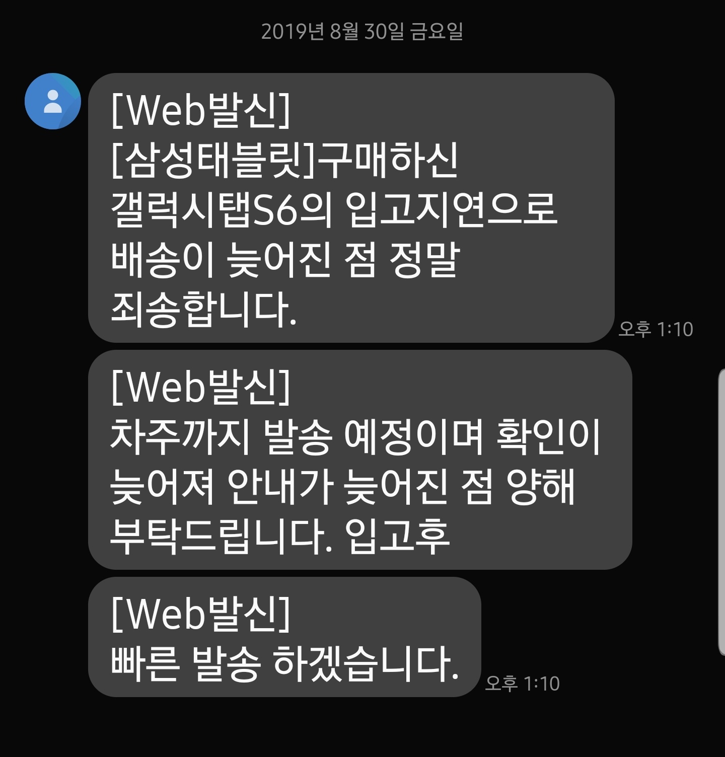 배송은 8월 29일에 예정이었습니다. 그러나 준비했던 수량이 부족했던 건지 배송이 늦을 수 있다는 문자가 오더군요.
