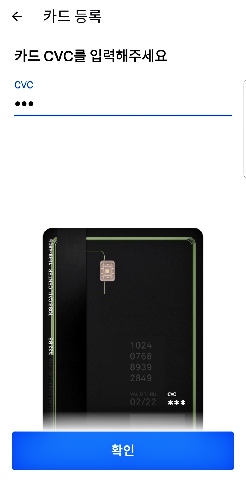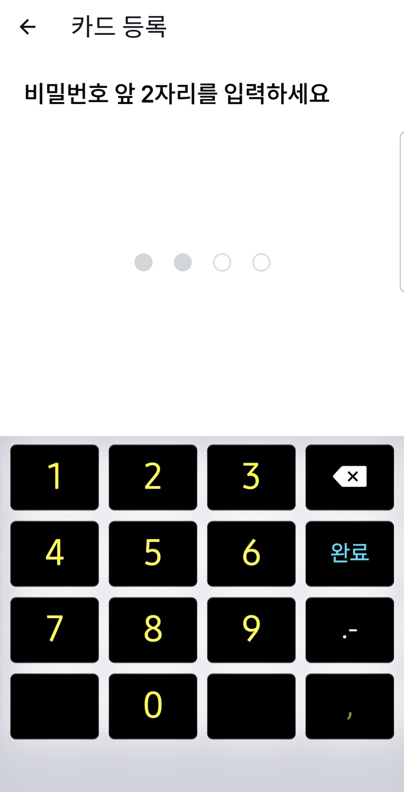 ▲ CVC번호와 비밀번호 앞 2자리를 누르면 카드 등록이 끝납니다.