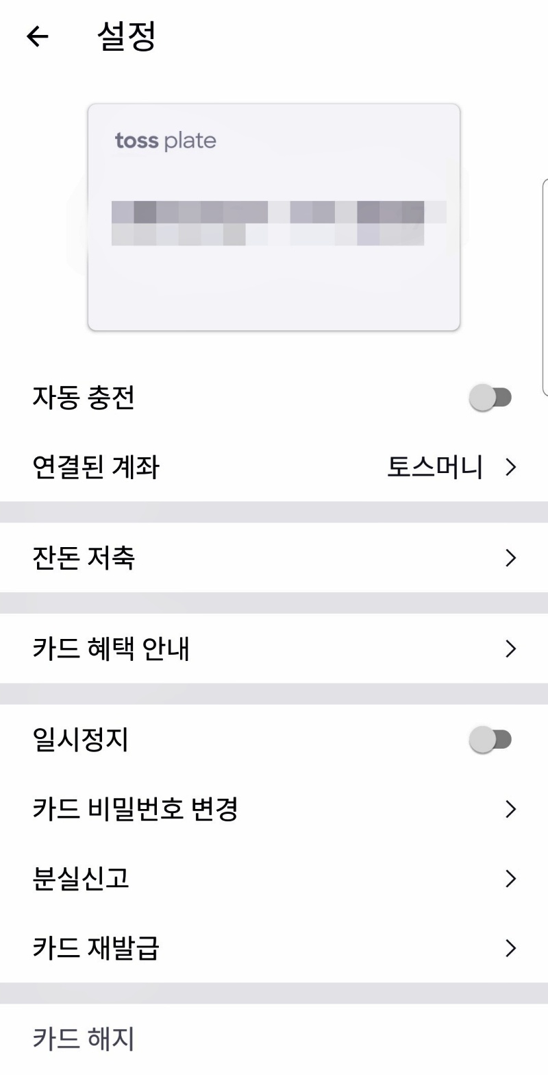 ▲ 토스 어플 내에서 토스카드 설정을 할 수 있습니다. 케이뱅크, 카카오뱅크처럼 어플 내에서 카드에 관한 모든 설정이 가능합니다.
