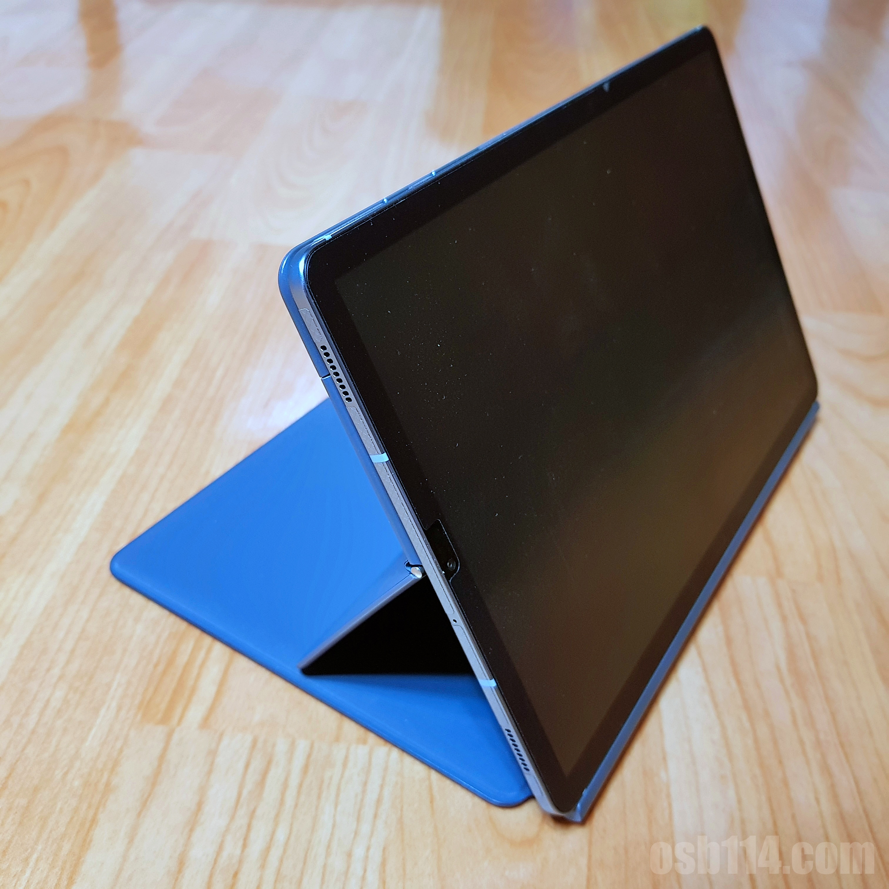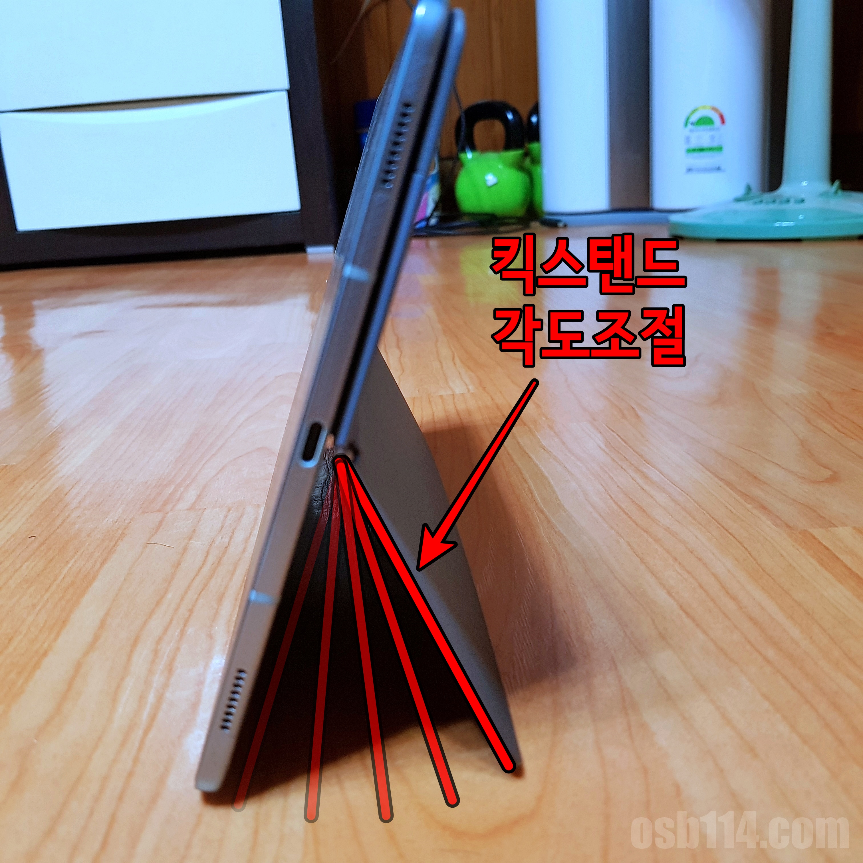 후면 케이스에는 태블릿의 각도 조절을 할 수 있는 킥스탠드가 있다. 서피스처럼 고정 단계가 있는 건 아니다. 그냥 힌지의 힘으로 버티는 구조이다. 오래 써서 힌지가 헐거워지면 고정이 제대로 안 될 수도 있겠다.
