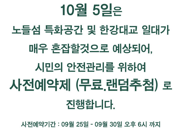 다음 주에(19년 10월 05일) 한화 불꽃축제가 있는데, 행사 당일 노들섬에서는 추첨을 통해 예약한 인원만 받는다고 한다.