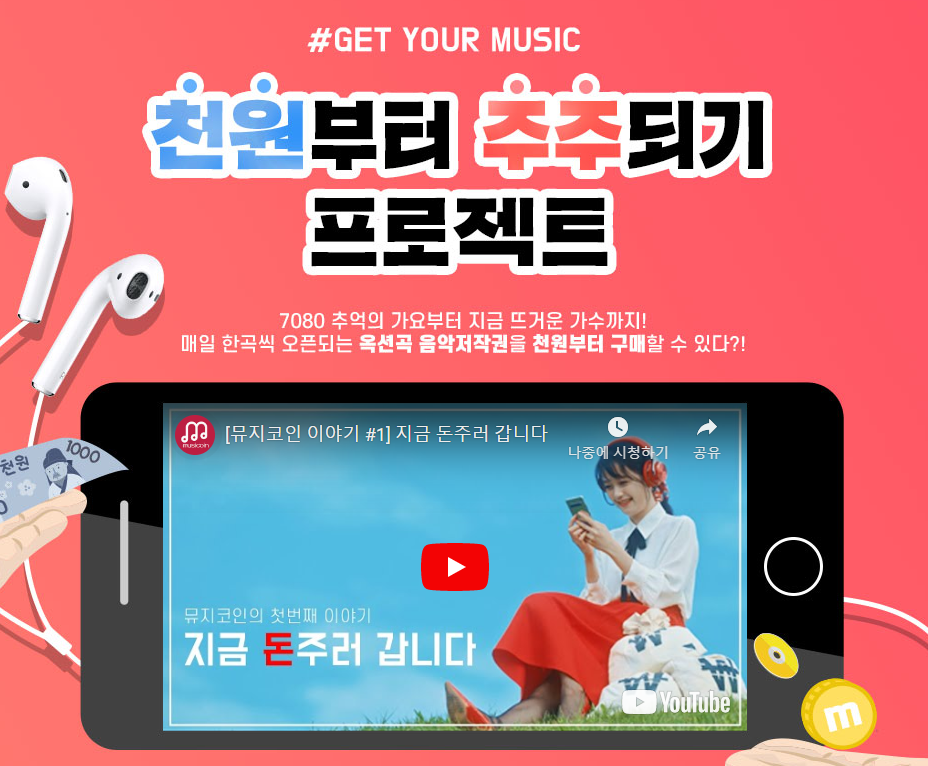 온라인 음원 저작권 경매 사이트인 뮤지코인에서 천원부터 주주되기 프로젝트 이벤트를 열었다.