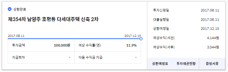 그래서 지금은 매달 나오는 수익금에 추가금을 보태서 10만원을 만든 후, 다시 재투자를 하고 있다. 현재 23건의 상품에 투자를 하고 있는데, 대부분 10만 원의 소액으로 분산 투자를 하고 있다. 이렇게 하면 상환 지연이 일어나도 부담이 적다는 장점이 있다. 그렇게 해서 18건의 상환을 무사히 마칠 수 있었다.