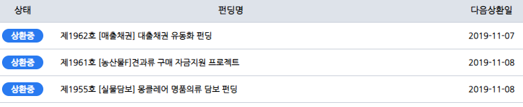 일단 10만 원씩 3건의 상품에 투자했다. 전부 5개월 미만의 단기 상품이고, 평균 수익률은 15%다.