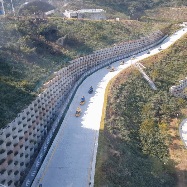 특별한 동력장치 없이 특수 제작된 카트를 타고 땅의 경사와 중력만을 이용해 트랙을 내려오는 다이나믹한 체험 레포츠시설로 방향조정과 제동이 가능하며, 어린이부터 어른까지 누구나 즐길 수 있는 무동력 바퀴 썰매입니다.