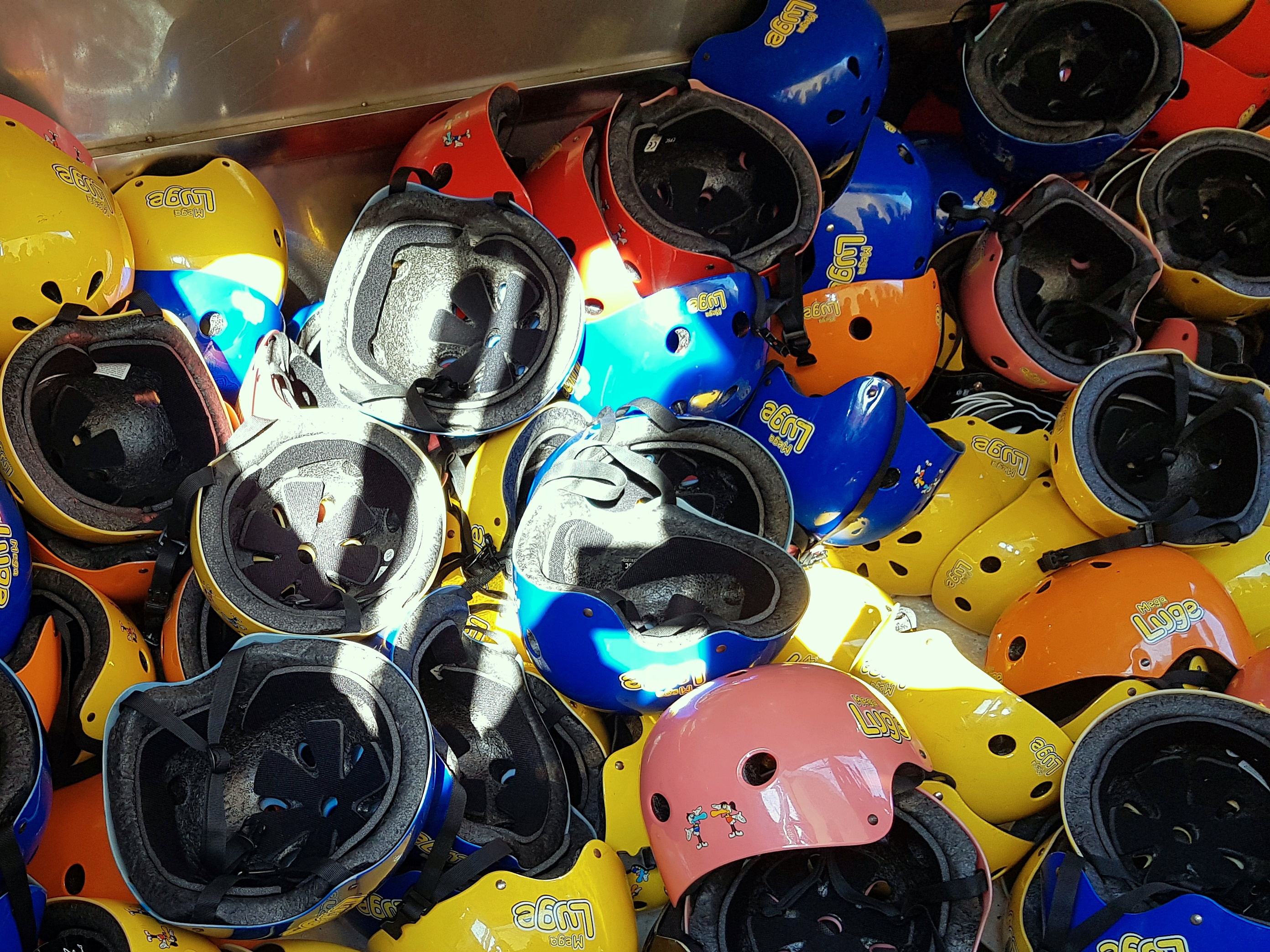 곤돌라에 탑승하기 전 루지를 탈 때 쓰는 헬멧을 고를 수 있다. 색상별로 사이즈가 다르니 골라서 쓰면 된다.