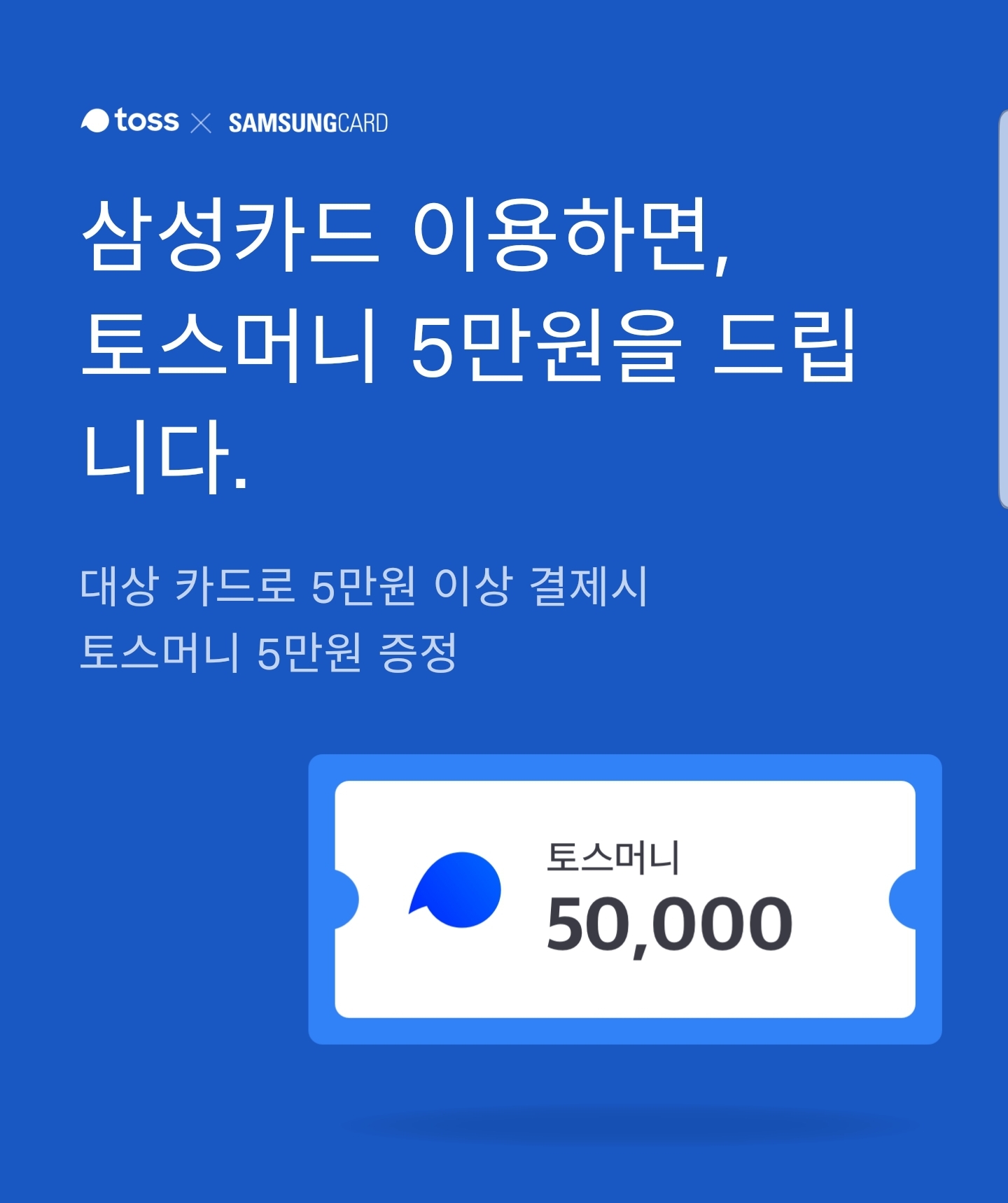 | 삼성카드 | 토스머니 5만원 | taptapO, 아멕스블루카드, 삼성카드4 | 연회비 100% 캐시백 | 5만원 이상 |