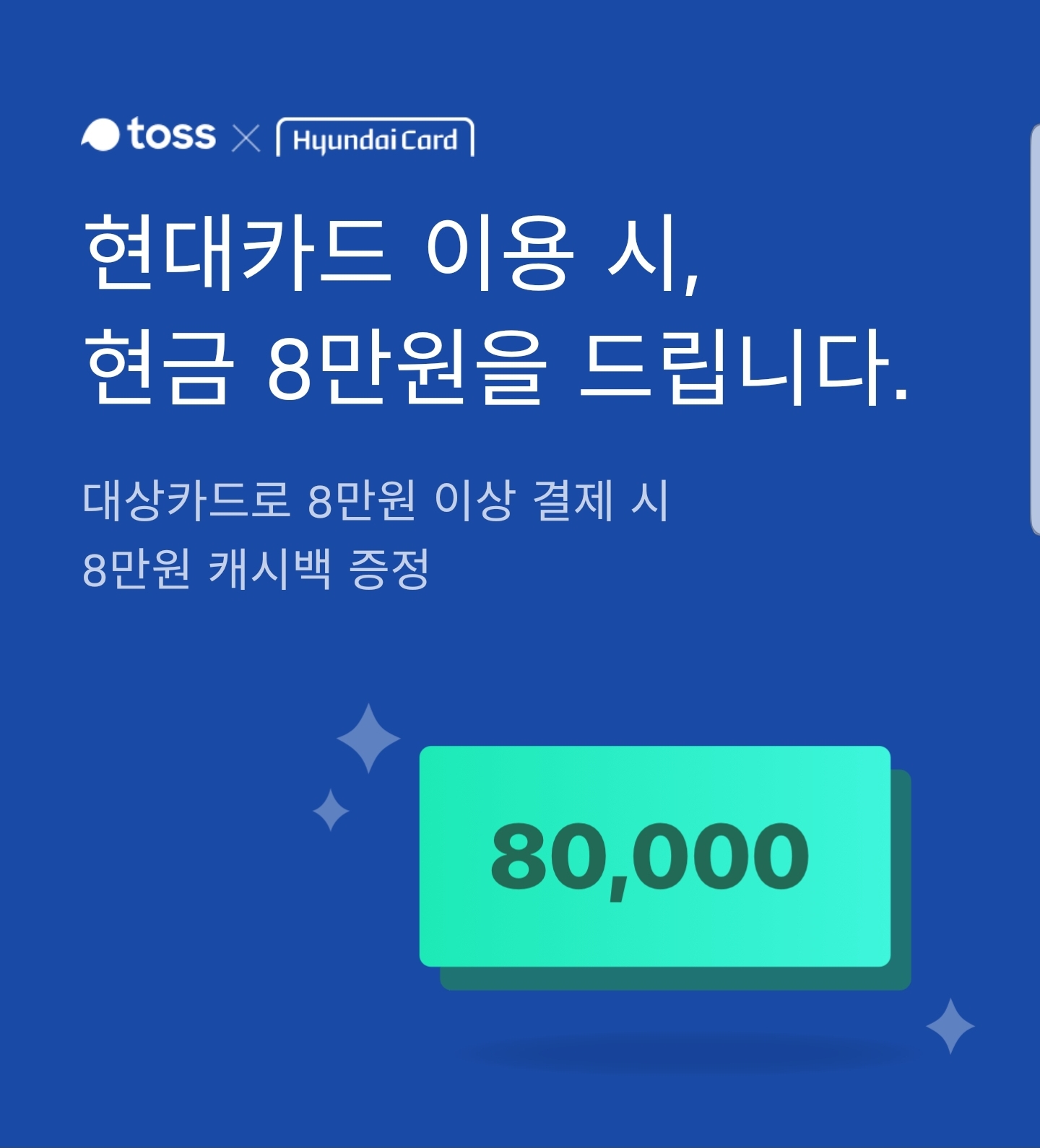 | 현대카드 | 현금 8만원 | 현대카드 ZERO (할인형) | 연회비 100% 캐시백 | 8만원 이상 |