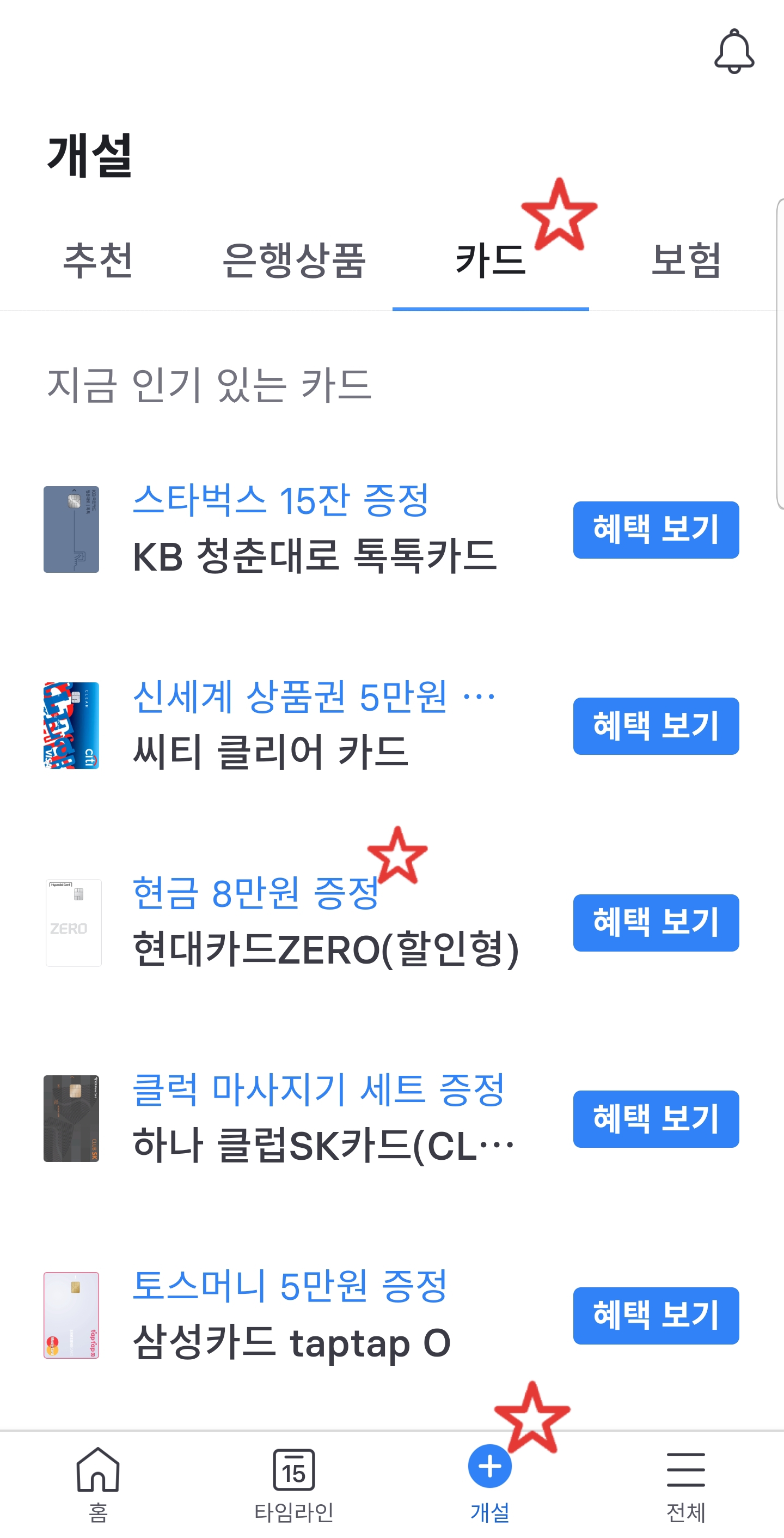 토스에서 카드 신청을 하려면, 개설 탭, 카드로 가면 카드를 신청할 수 있다.