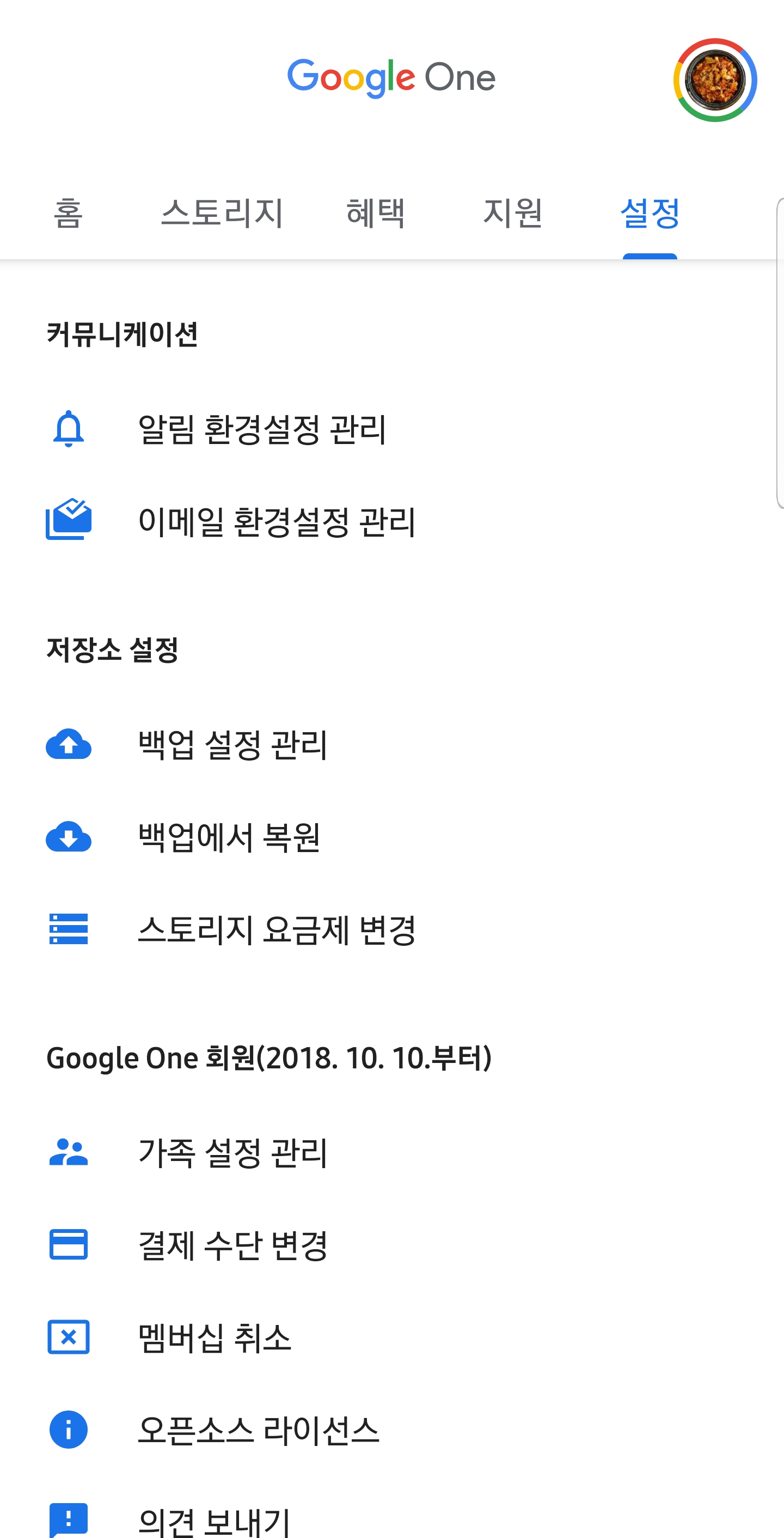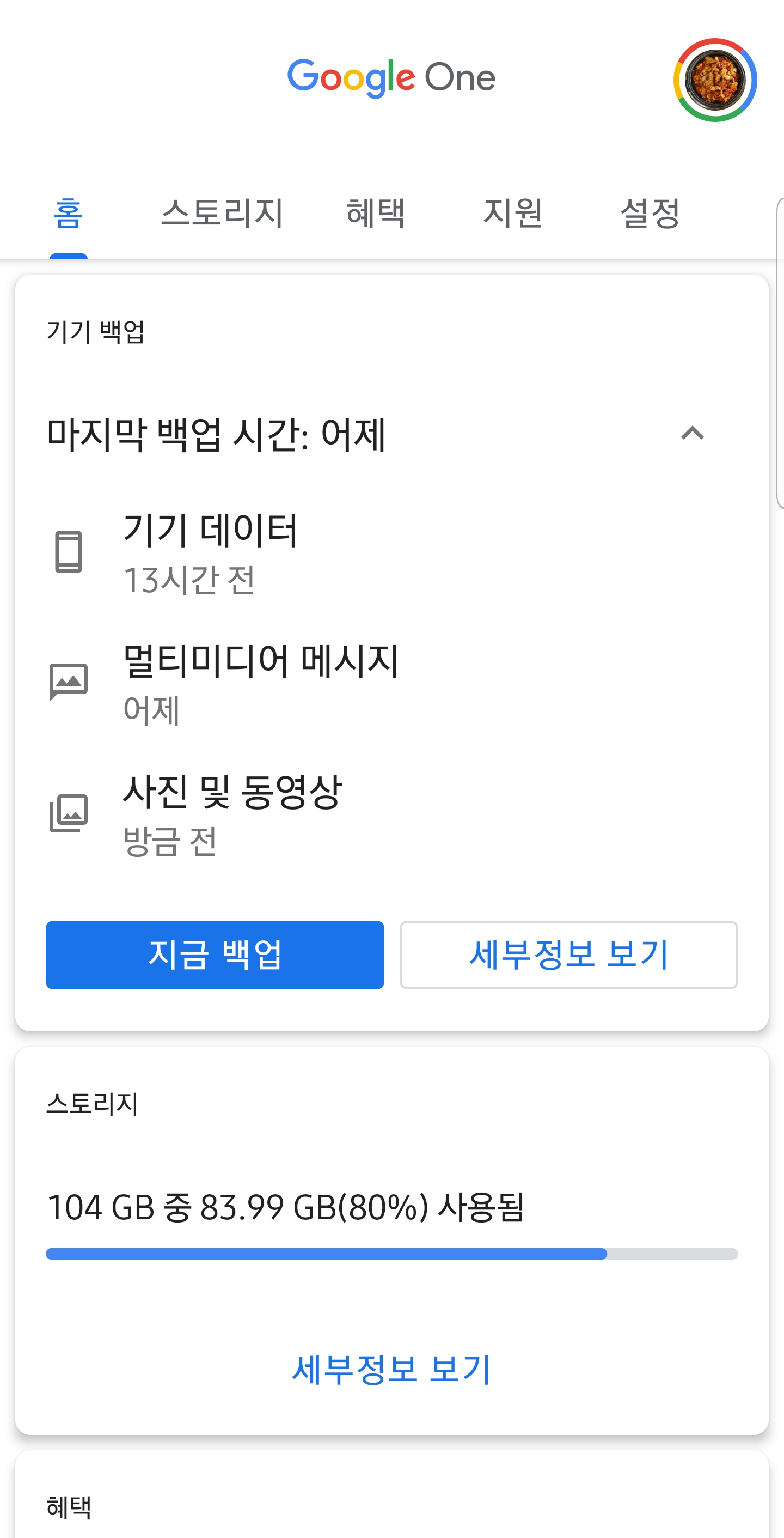 구글 원 어플리케이션을 통해 백업 설정, 받은 혜택 확인, 추가 정보 등을 간편하게 확인할 수 있습니다.