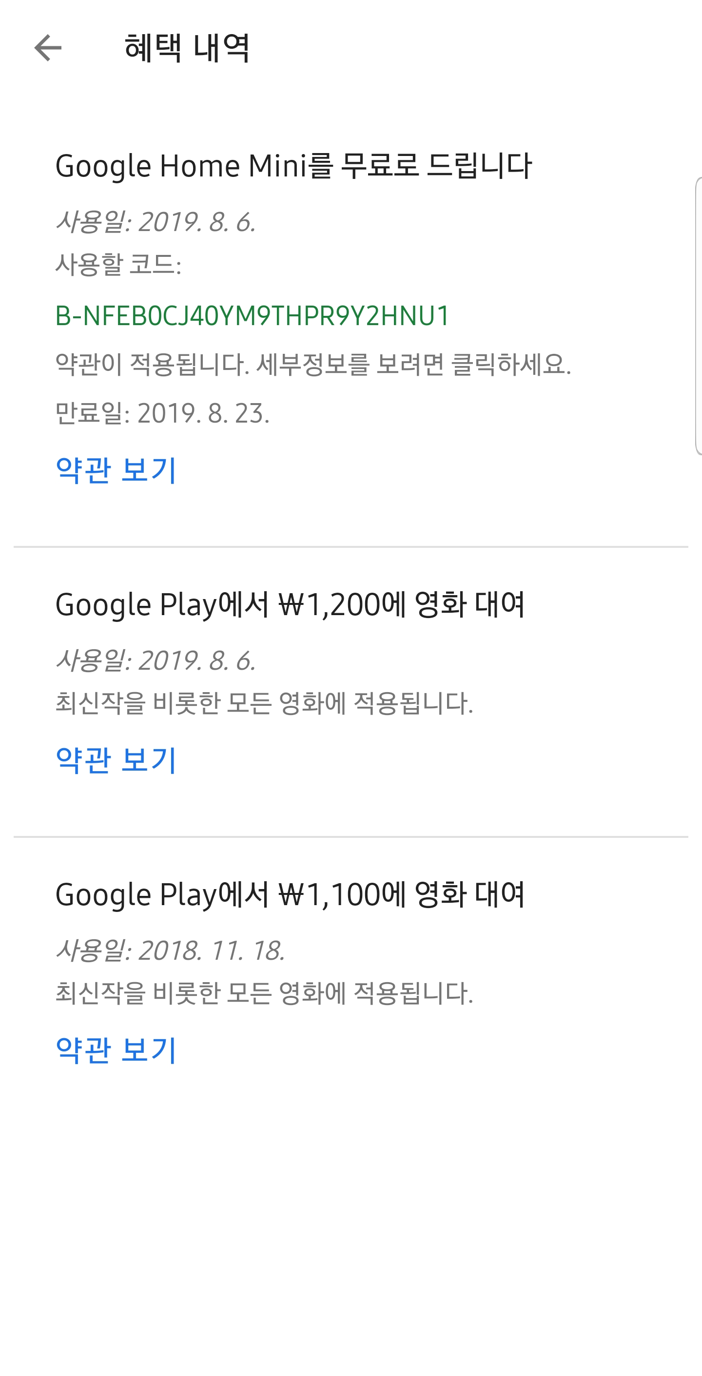 저는 구글 원으로 영화 할인 쿠폰과 구글 홈 미니 무료 증정 혜택을 받았습니다.