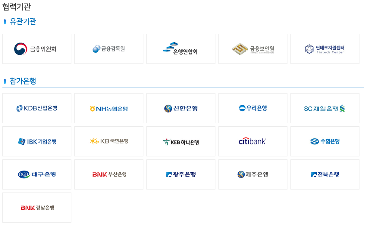 참가은행: KDB산업은행, NH 농협은행, 신한은행, 우리은행, SC제일은행, IBK 기업은행, KB 국민은행, KEB하나은행, 시티뱅크, 수협은행, 대구은행, 부산은행, 광주은행, 제주은행, 전북은행