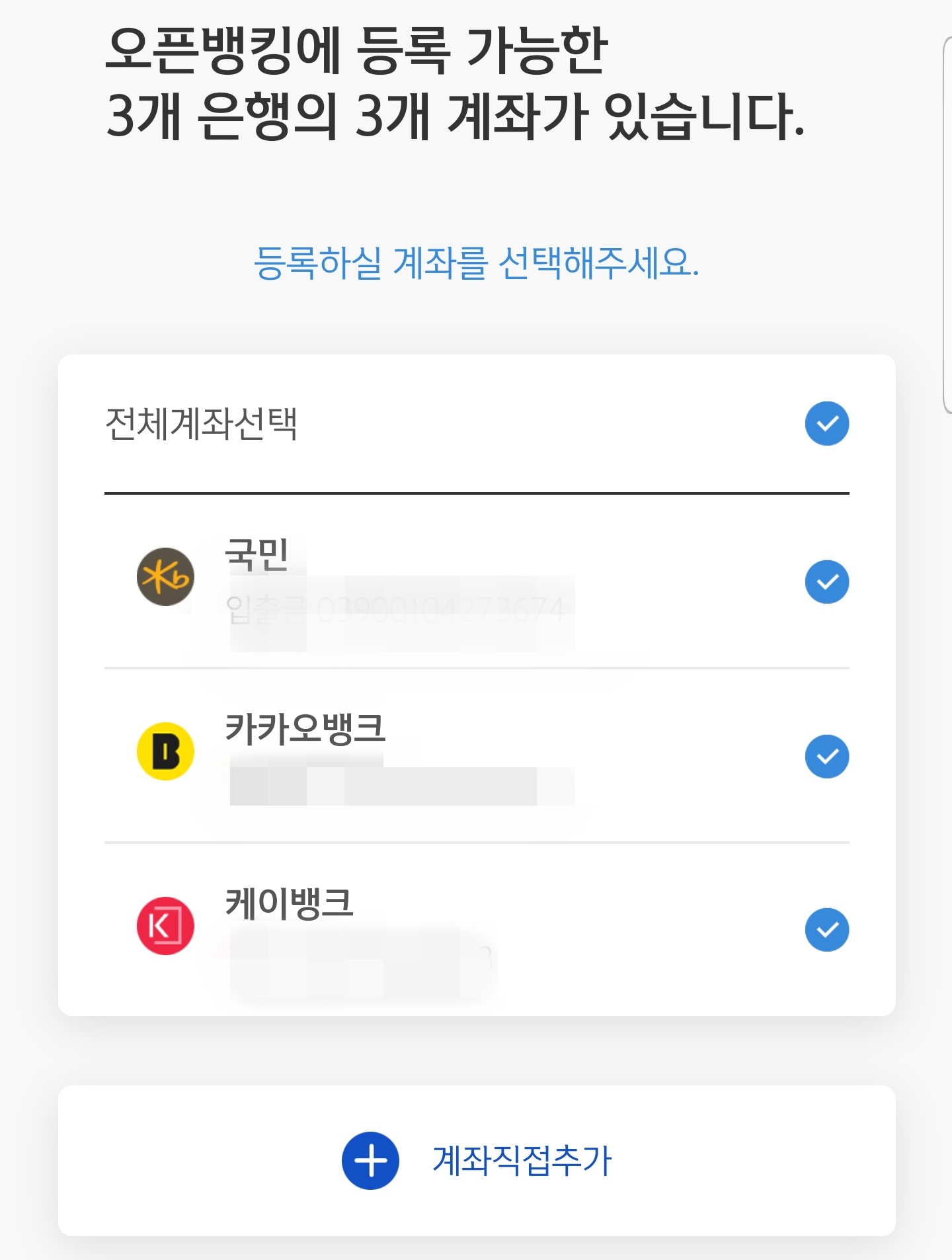 신청하니 국민, 케이 뱅크는 자동으로 계좌가 추가되었습니다. 카카오 뱅크는 계좌 직접 추가로 신청했습니다.