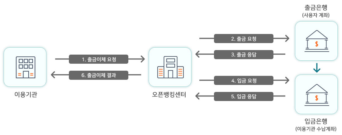 금융감독원이 관리하는 오픈뱅킹센터가 중간 다리 역할을 합니다. 출금, 입금 등의 요청을 오픈뱅킹센터가 처리해 주는 방식이죠. 사이트에 가면 API, 참여 기관, 은행 등의 정보를 알 수 있습니다.