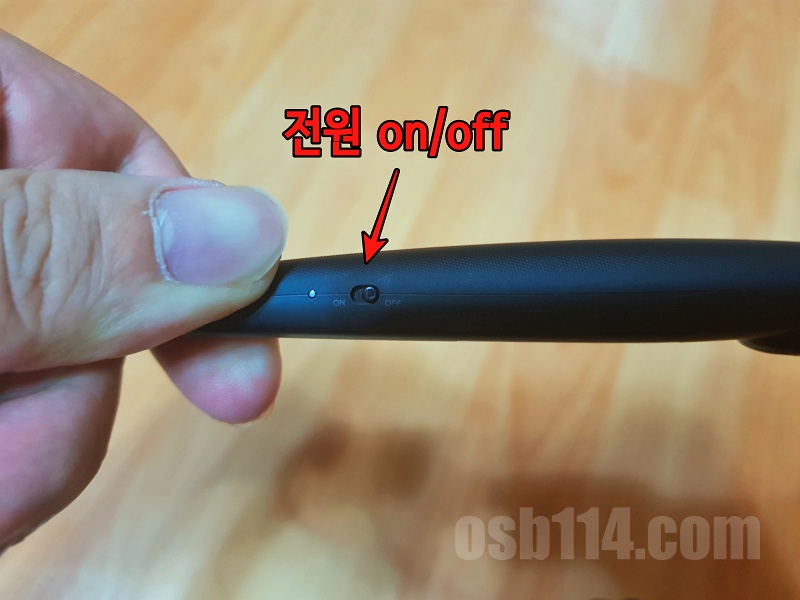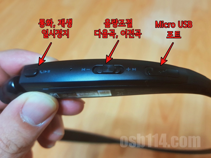 바깥쪽에 통화, 재생, 일시정지, 음량 조절 등의 컨트롤 관련 버튼과 충전할 수 있는 USB 포트가 있었고, 안쪽에는 전원 버튼이 있었습니다.