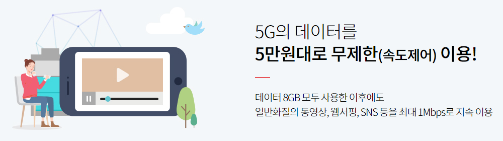 8GB 소진 후 무제한 요금제라고 광고하긴 하지만, 1 Mbps 속도제한이 있습니다. 이러면 5G를 쓰는 의미가 없죠.