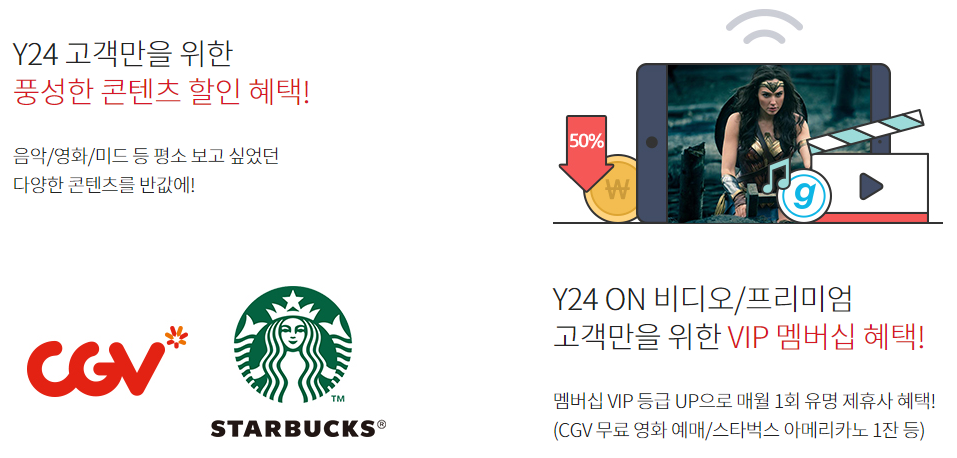 다만, Y24 ON 요금제는 프리미엄 혜택에서 프라임 무비팩과 미디어 팩 50% 할인의 추가 혜택을 제공합니다.