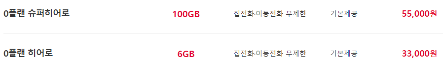 0플랜 슈퍼히어로가 100GB에 55,000원입니다.