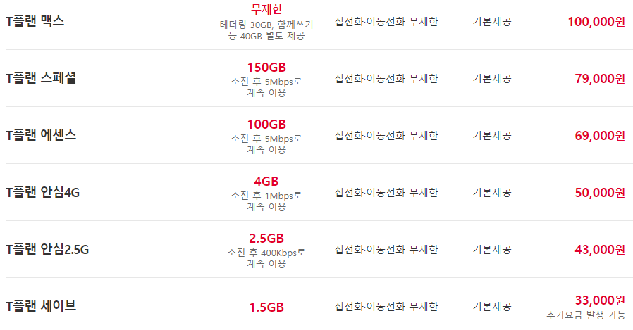 그래도 SKT사이트에 있는 자료들 중에 사람들이 많이 쓰는 요금제, 추천할만한 요금제 위주로 정리해보았습니다.