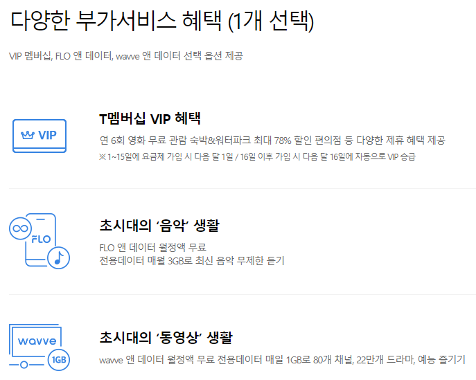 거기에 FLO 데이터 무료, VIP 멤버십, Wavve 데이터 무료 등의 혜택을 제공하고 있습니다.
