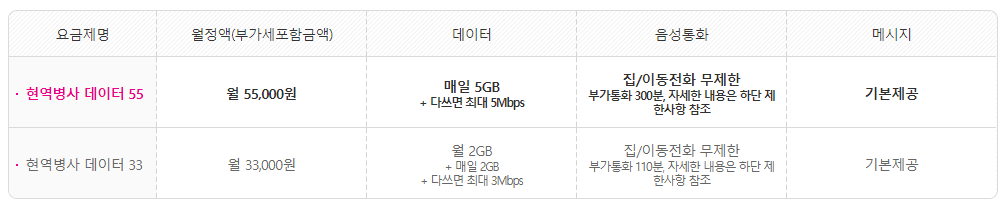 군인 요금제는 조금 저렴하게 내놓았습니다. 조건은 같지만, 타 요금제보다 14,000원 저렴한 월 55,000원에 무제한 데이터를 이용할 수 있습니다.