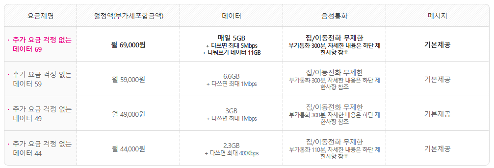 추가 요금 걱정 없는 데이터 요금제는 4가지로 구성되어 있습니다. 69 요금제, 59 요금제, 49 요금제, 44 요금제이죠.