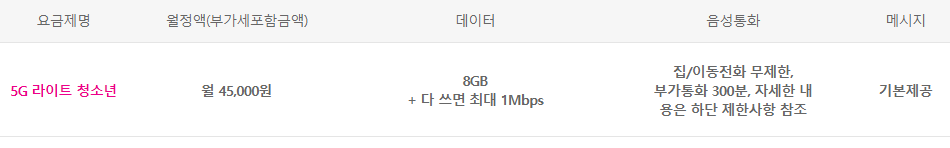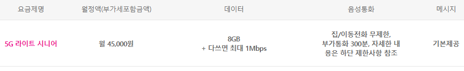 LG U 플러스 5G 요금제는 특이하게도 청소년과 시니어를 위한 요금제도 있습니다. 월 45,000원에 데이터 8GB를 쓸 수 있는 요금제입니다. 위의 5G 라이트 요금제보단 저렴하지만, 그래도 이 요금제들을 택하는 사람들은 많지 않을 것 같습니다.