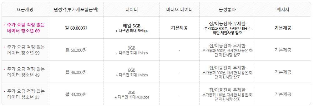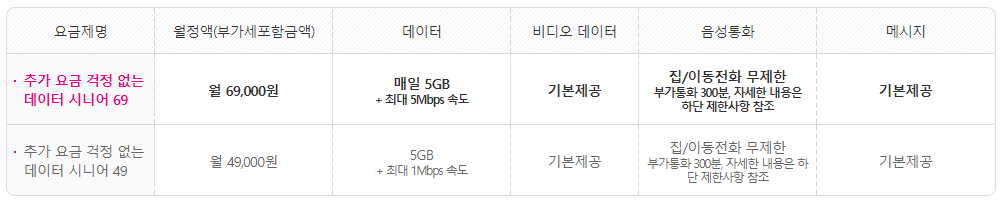 가격도 청소년, 시니어 모두 6만 9천 원입니다. LG는 연령 구분 없이 69 요금제가 제일 나아 보입니다.