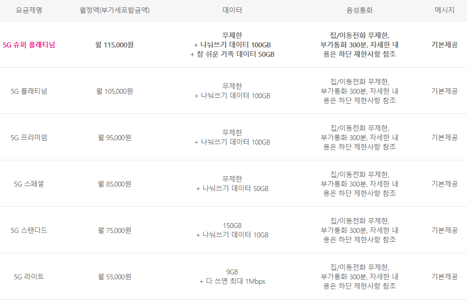 데이터가 완전 무제한은 KT 요금제도 마찬가지입니다. 하지만 나눠 쓰는 데이터는 없습니다. 때문에 가족이 전부 LG요금제를 쓰는 경우, 5G 슈퍼 플래티넘도 괜찮은 선택이라 생각합니다.