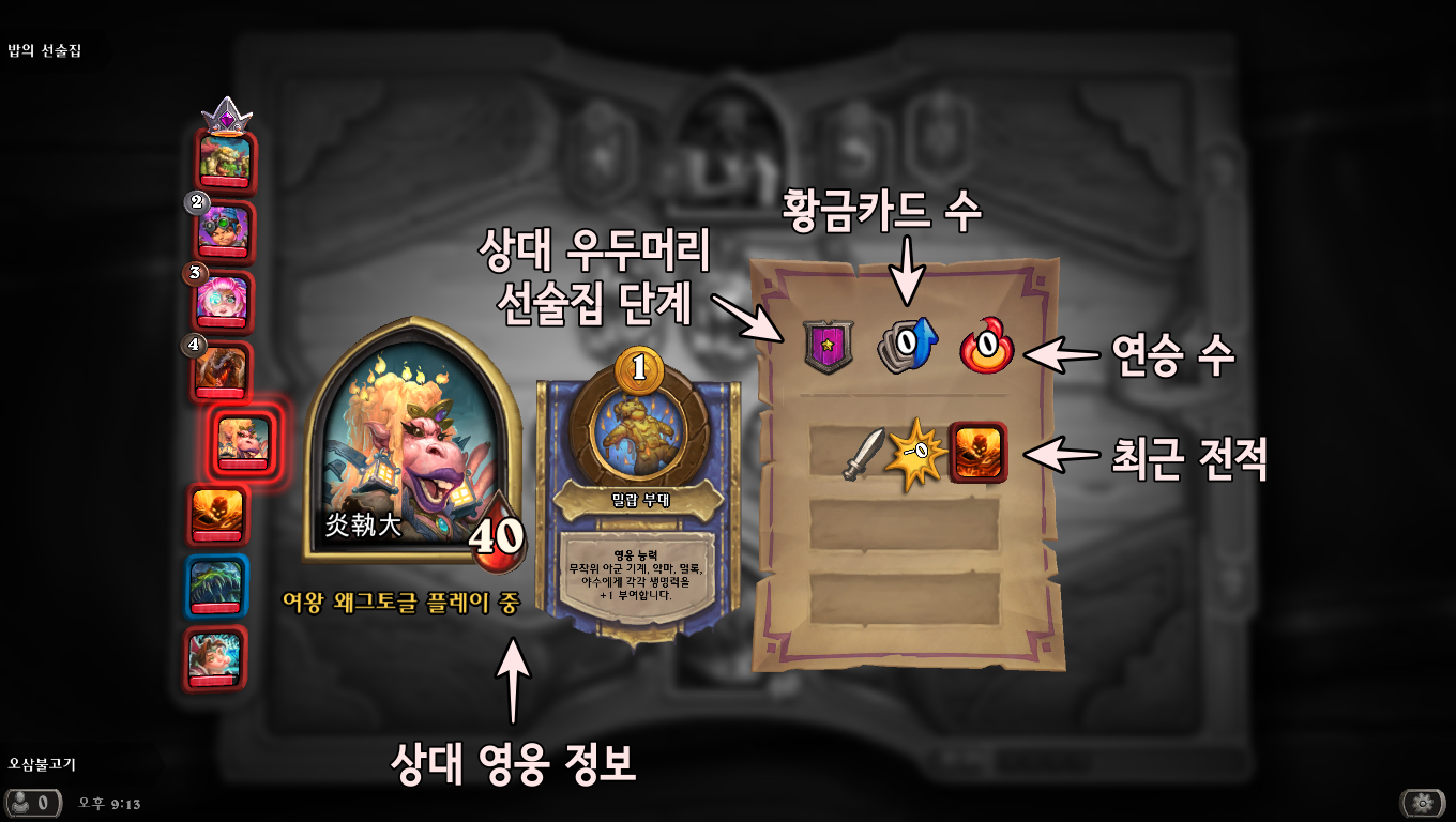 하스스톤 왼쪽에는 카드 플레이 기록이 있는데, 전장에서는 카드기록 대신 8명 영웅들의 정보를 볼 수 있습니다.