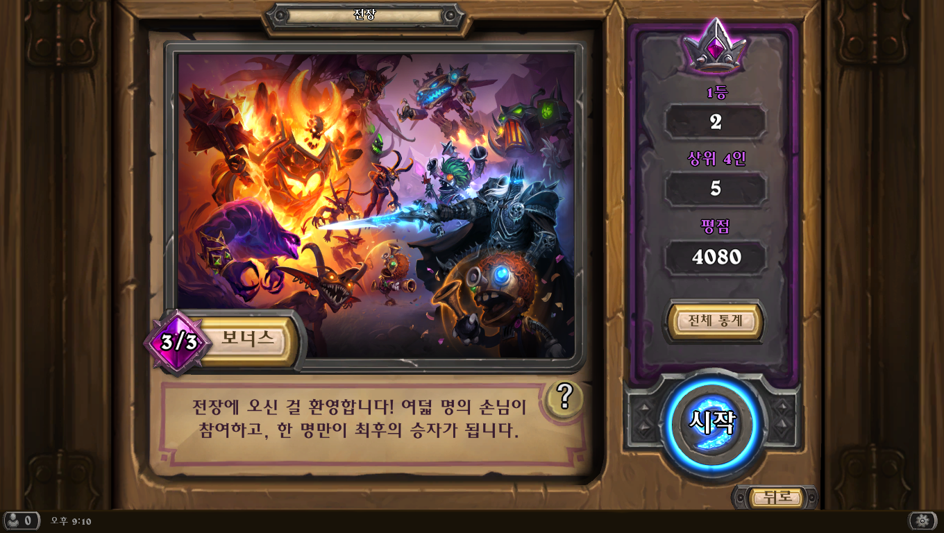 하스스톤 전장의 메뉴 화면입니다. 1등 횟수, 4등 안에 들어간 횟수, 그리고 평점이 나와 있습니다.