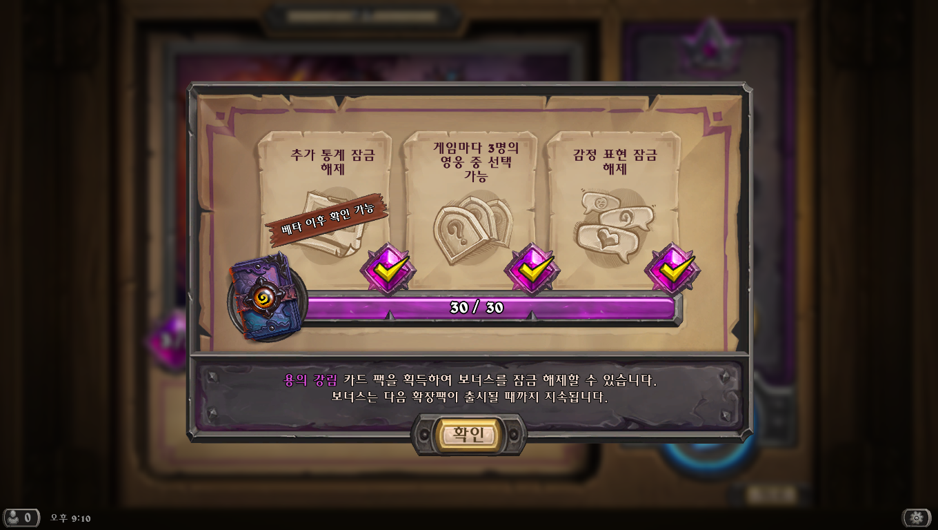 보너스는 다음 확장팩이 출시될 때까지 지속된다고 되어 있습니다. 새 확장팩이 나오면 다시 카드팩을 모아 잠금을 해제해야 하는 건지는 모르겠습니다.