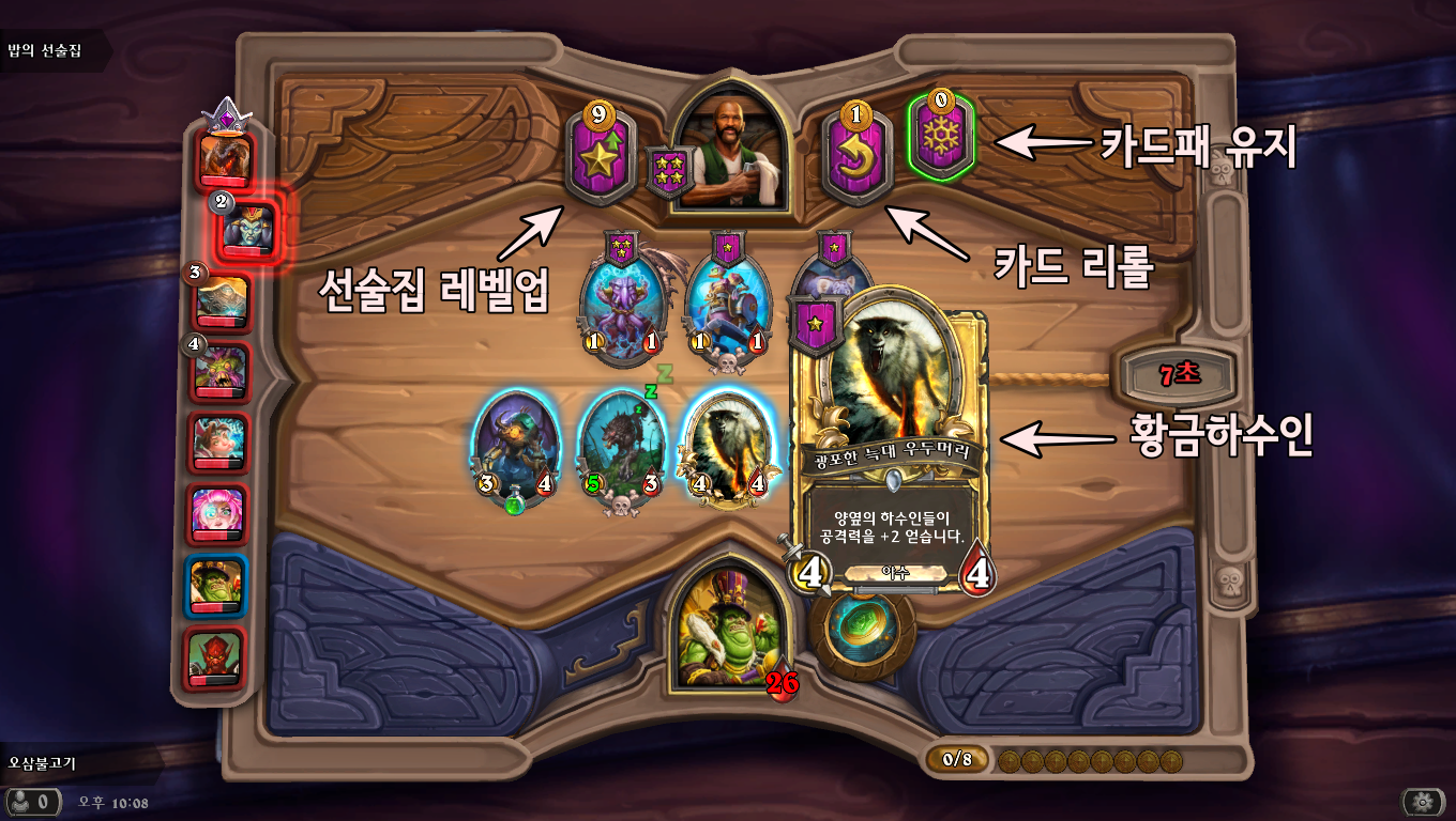 미래를 위해 선술집 레벨업을 할지, 하수인을 모을지, 같은 하수인 3개를 모아 황금 하수인을 만들지, 카드 리롤을 해서 원하는 하수인을 찾을지, 현재 선술집의 카드 패를 유지할지 등의 무수히 많은 선택과 생각을 해야 하죠.