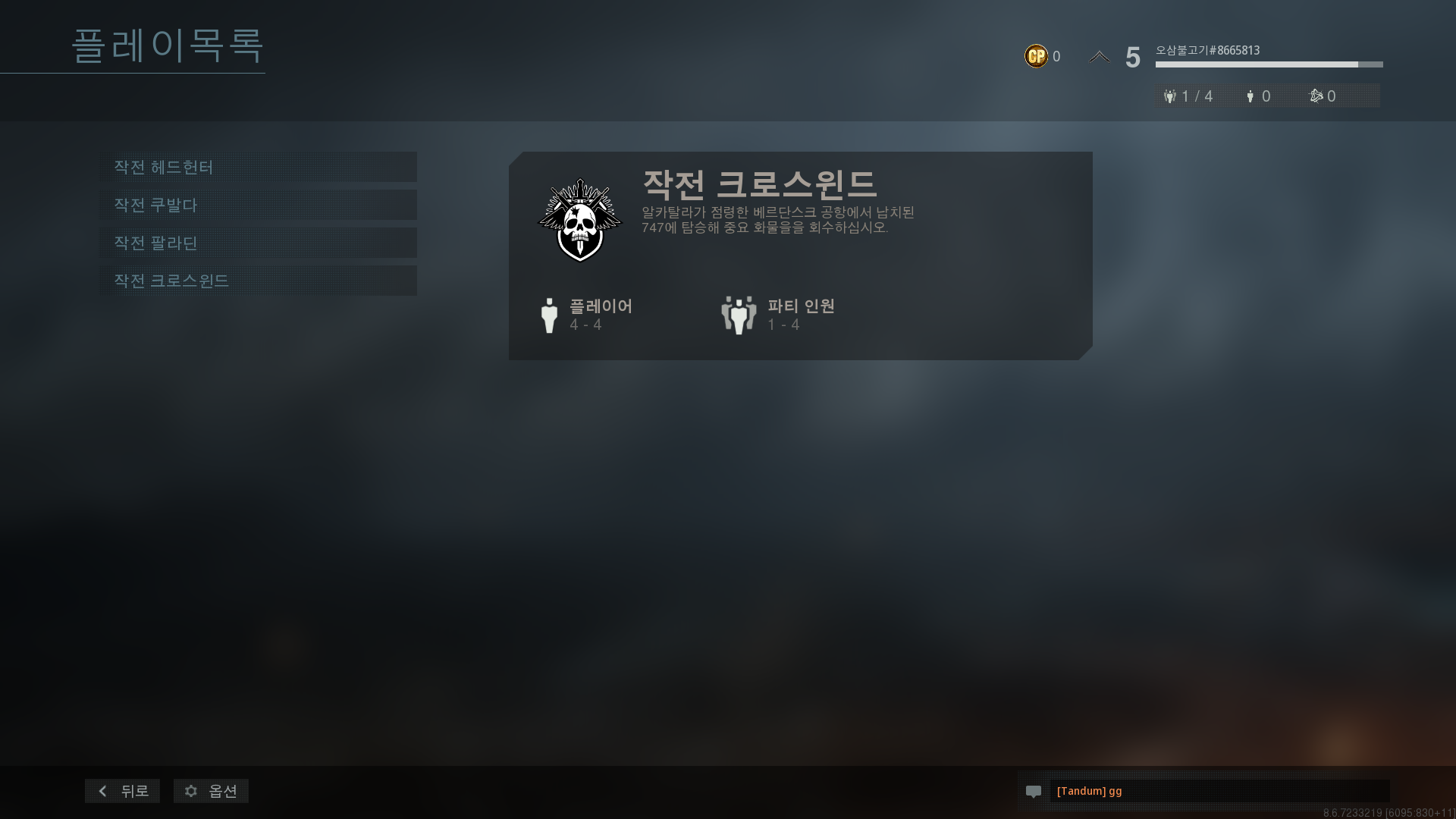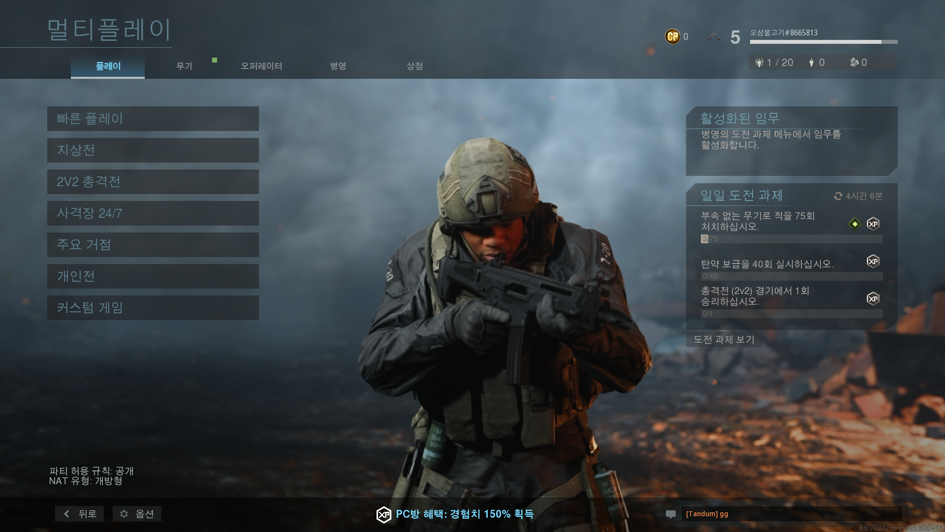 메뉴에는 빠른 플레이, 지상선, 2V2 총격전, 사격장 24/7, 주요 거점, 개인전, 커스텀 게임이 있었습니다.