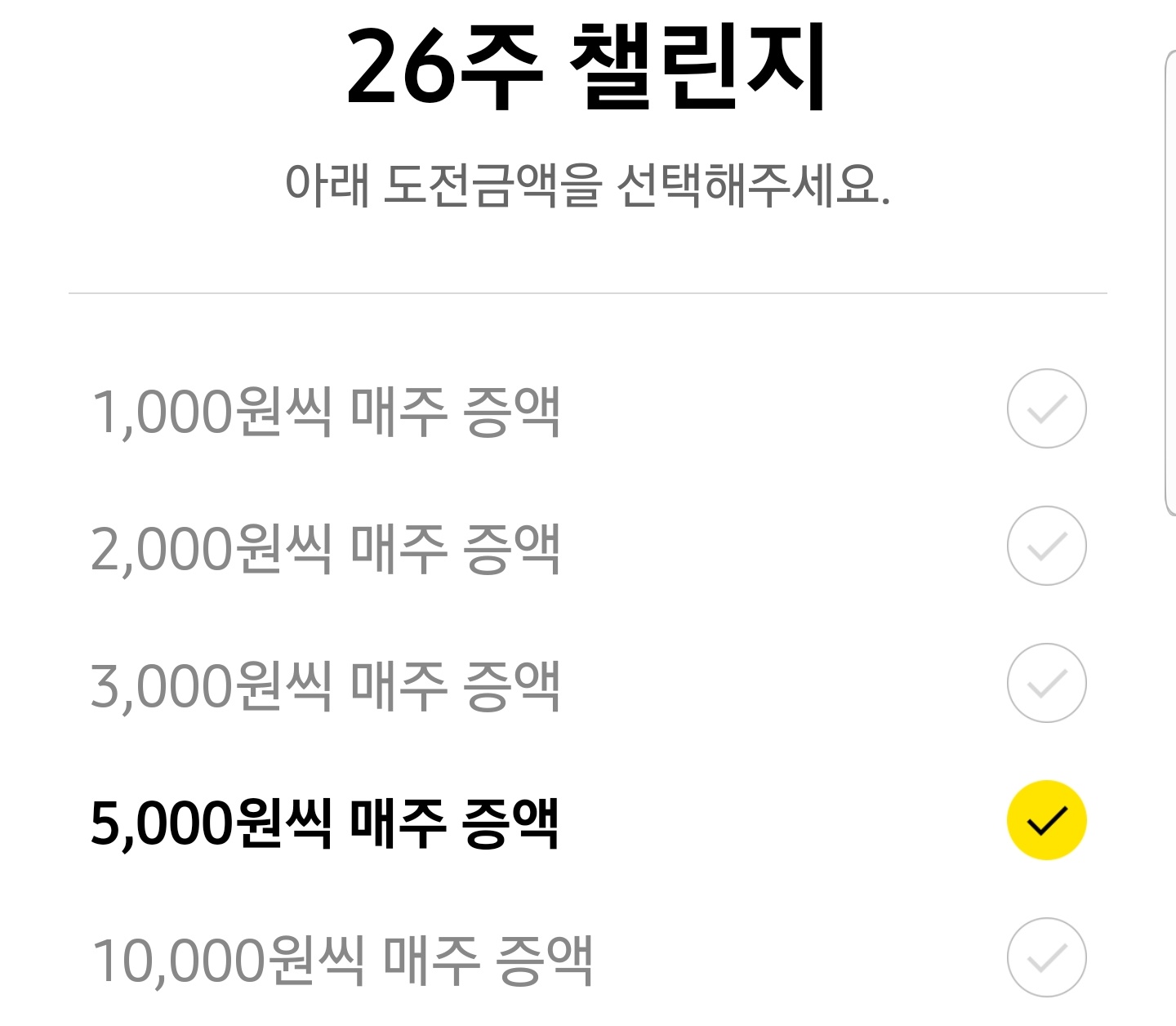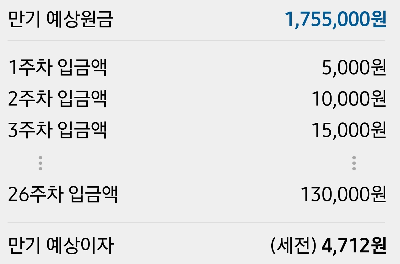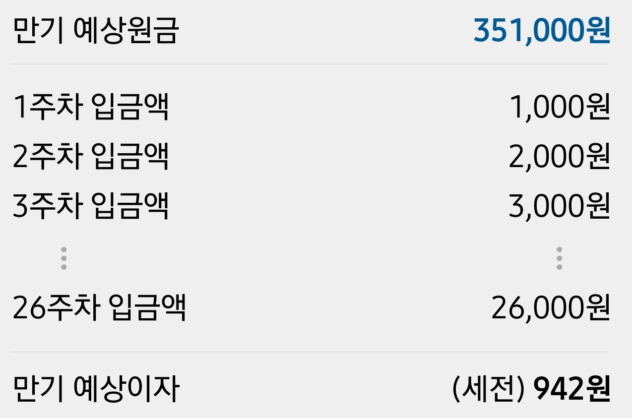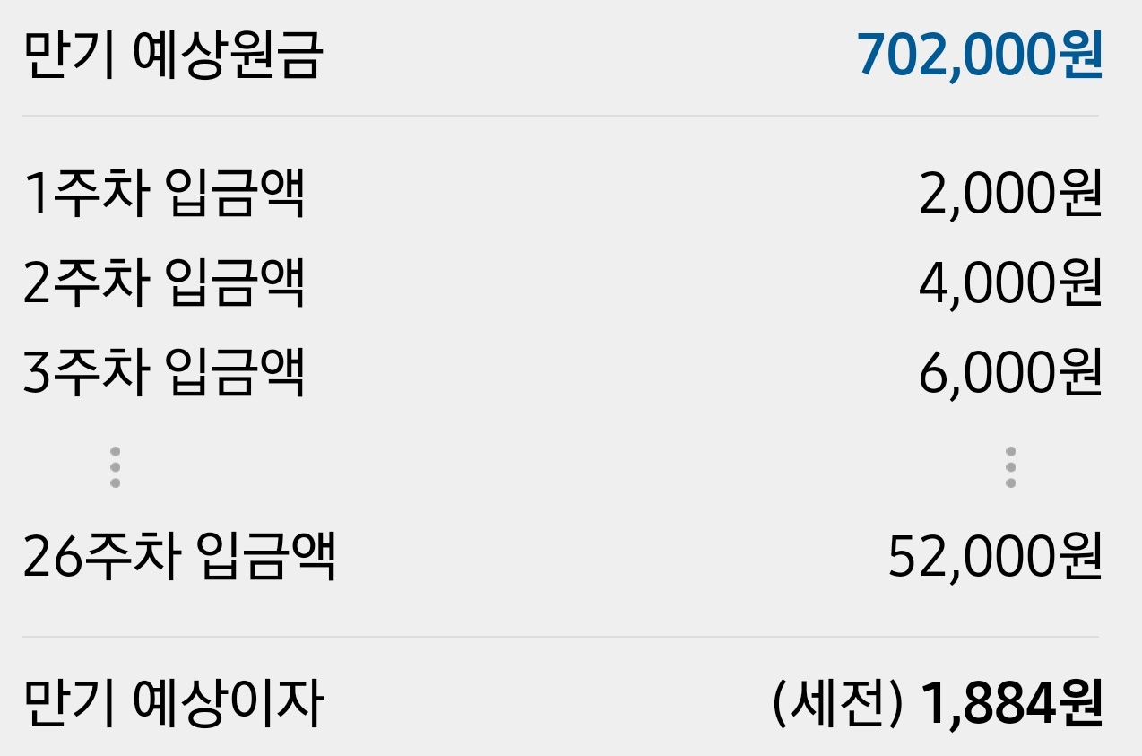 카카오뱅크 26주 적금은 매주 지정한 금액만큼 증액해서 적금을 하는 방식입니다.