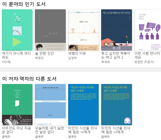 같은 작가의 다른 도서를 읽는 것도 좋았습니다. 책을 읽다 보면 좋아하는 작가가 생기기 마련입니다. 그래서 마음에 드는 작가의 책을 읽으면 작가의 다른 책도 읽고 싶기 마련이죠. 밀리의 서재는 보유 권수가 많다보니 이런 시스템이 잘 되어 있었습니다.